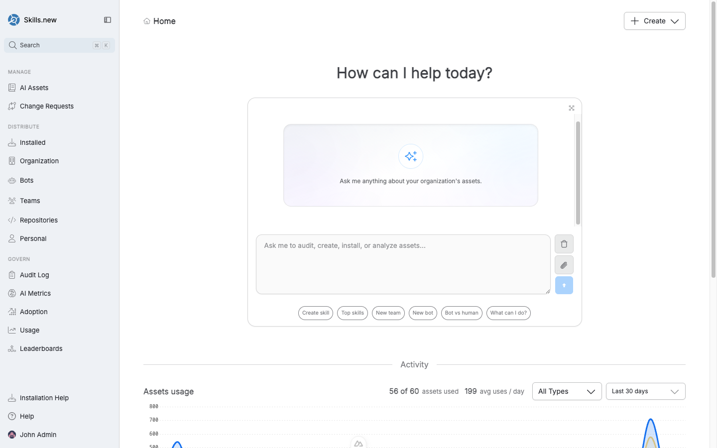 <figure><img src="https://2832637360-files.gitbook.io/~/files/v0/b/gitbook-x-prod.appspot.com/o/spaces%2F-M1bR_-Od0islbiOl4G0%2Fuploads%2Fgit-blob-2d9be4e6e0a5bd5f05644b1fd75957013080965a%2Fhome.png?alt=media" alt=""><figcaption><p>The Skills.new home screen, organized around Manage, Distribute, and Govern</p></figcaption></figure>
