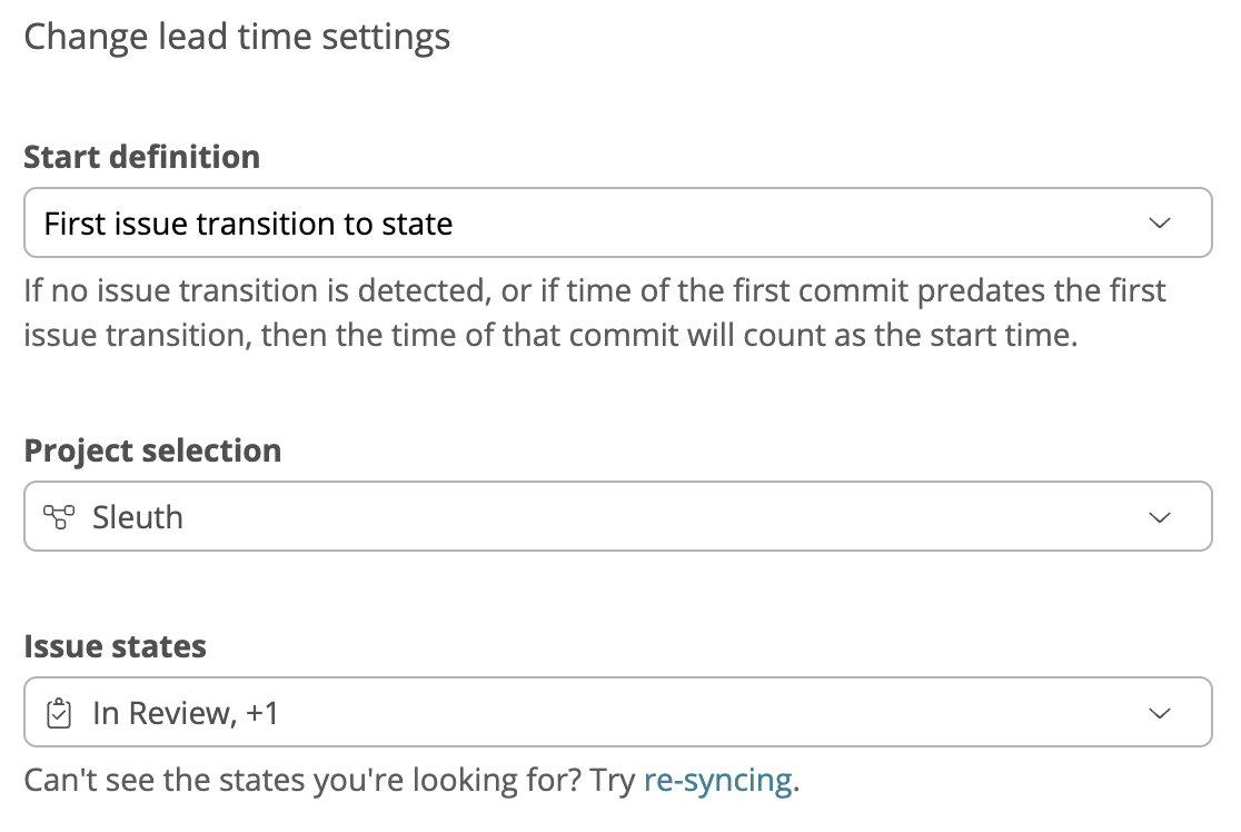 In the Issue states drop-down, select all states that should be counted as "in progress" staets with regard to your CLT definition. It's important that you select all such states because some issue tracker workflows are more free-form than others (e.g. allowing an issue to go straight from "To Do" to "In Review"). Sleuth will look for the earliest transition into any of the states you select here (including cases where the issue is initially created in one of these states), so it's important to be exhaustive here.