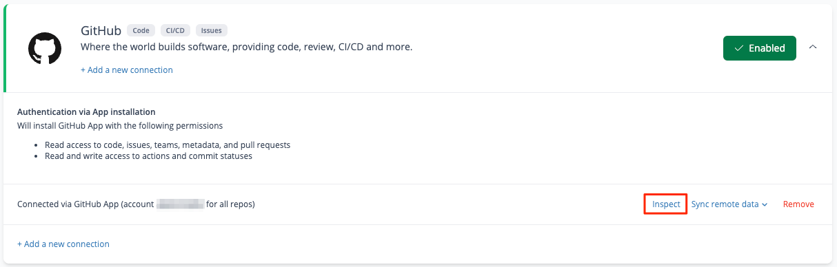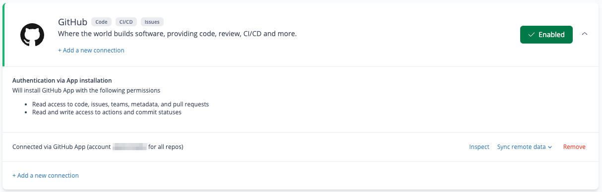 7. Upon successful integration, you'll see **GitHub** marked as **Enabled** and a list of connections (*you can have more than one*) specified in the format **Connected via GitHub App (account `<GitHub user account>` for \_\_\_\_\_\_\_\_\_\_\_\_\_\_ repos.**&#x20;