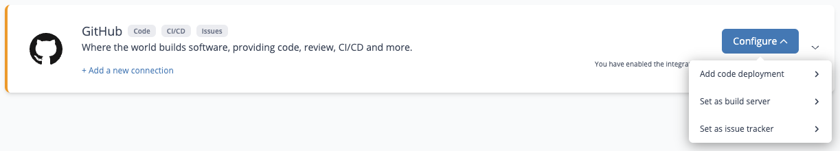* an **issue tracker**: select a Sleuth project from the list to set GitHub as the `Issue integration provider` for the selected project