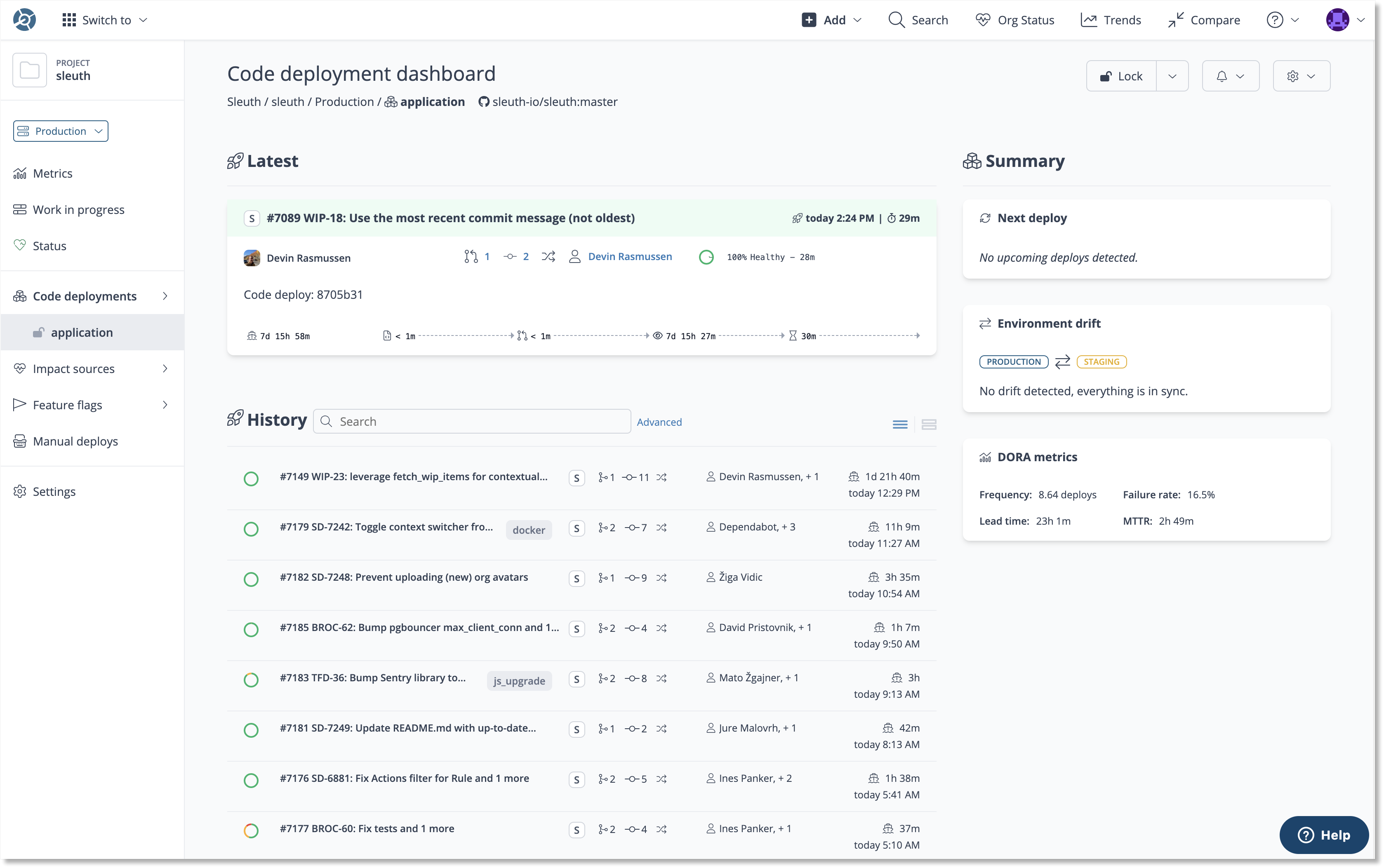 * Highlight [drift between your different deployment environments](https://help.sleuth.io/modeling-your-deployments/code-deployments/environment-drift)