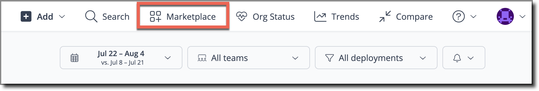Access the Automations Marketplace either by clicking the **Marketplace** item in Sleuth's top navigation or by navigating directly to [marketplace.sleuth.io](http://marketplace.sleuth.io)