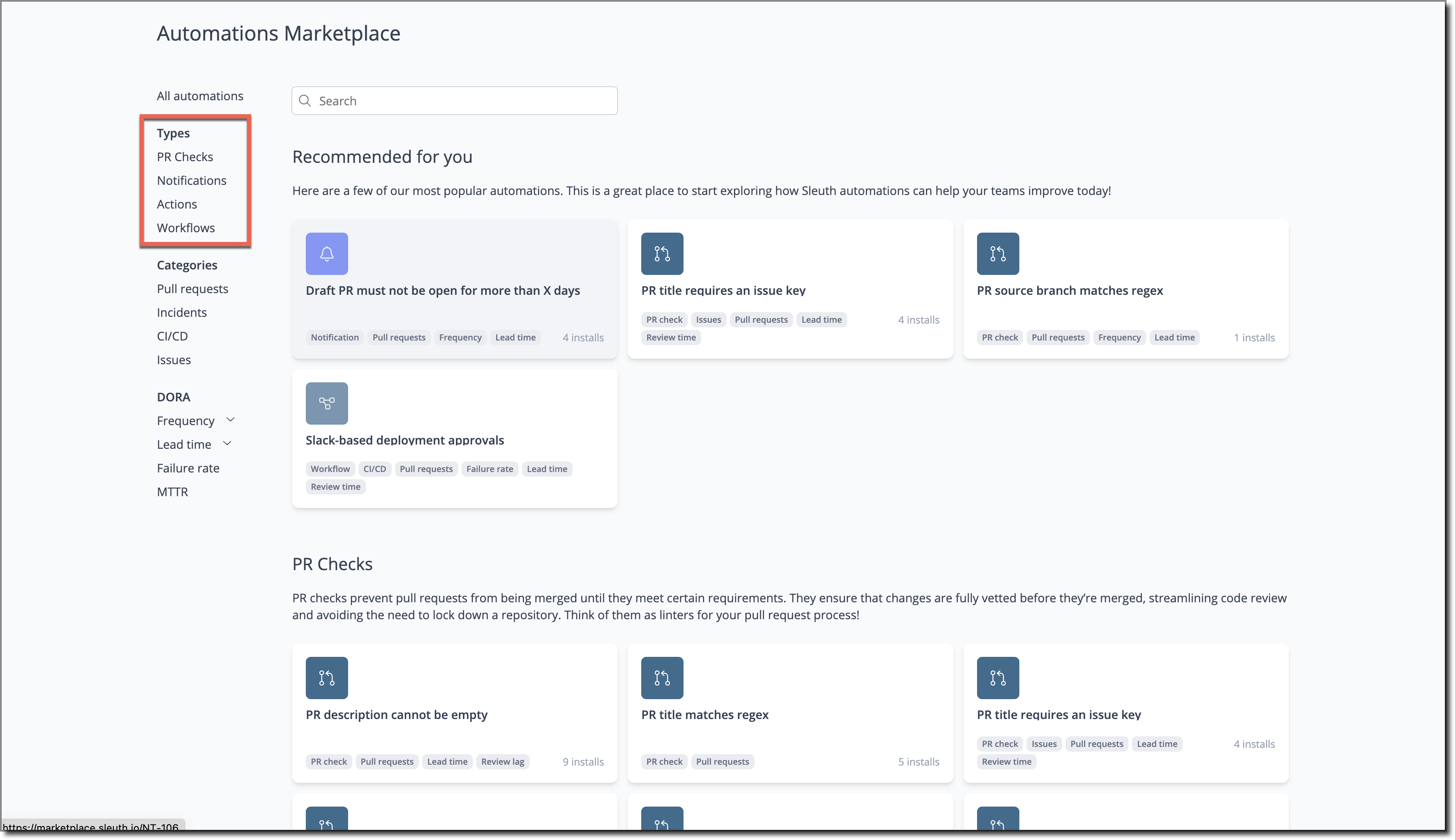* **DORA** tags allow you to search for automations designed to improve a specific DORA metric (or sub-metric). Sleuth also uses these DORA tags to [suggest specific automations](https://help.sleuth.io/sleuth-automations/automations-marketplace/smart-suggestions) in the context of your unique bottlenecks.\